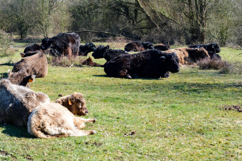 In het gebied zijn een aantal uitkijkpunten om dieren te spotten. Deze zijn blijkbaar zeer vandalismegevoelig. In 2013 werd er zelfs één in brand gestoken. Bij de heropbouw heeft men dan ook gekozen voor het robuustere materiaal cortenstaal. Ik zag aan de uitkijkpunten vooral vogels, helaas niet de vossen of reeën die er ook zouden zitten. Het pad loopt ook langs begrazingszones waar je het Galloway rund tegen het lijf loopt (niet letterlijk, er wordt gevraagd om 25 meter afstand te houden). Het zou een sociaal dier zijn en dat kan ik alleen maar beamen als ik ze daar allemaal gezellig bij elkaar zag liggen te genieten van de zon. Ik dacht eerst dat dit ras oorspronkelijk uit Ierland zou komen, maar heb me wellicht vergist met de Ierse stad Galway. Galloway is een gebied in het zuidwesten van Schotland. De Galloway runderen worden vaak ingezet in natuurbeheer, onder meer omdat ze niet agressief zijn en weinig zorg nodig hebben. Ze hebben een dikke vacht die hen goed beschermt tegen regen en wind. Het zijn stevige dieren, let dus op voor het stevigs dat ze ook op de weg kunnen achterlaten (wel een dankbaar onderwerp om nog eens op scherptediepte te oefenen met mijn fototoestel zoals je hieronder kan zien :-)).
