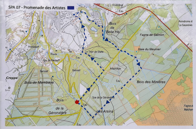 De dag na onze verkenning van de Ninglinspo, trokken we naar Spa voor nog een wandeling: de Promenade des Artistes. Deze wandeling start aan de bron van de Géronstère waar je je makkelijk kan parkeren. We zagen op een bord daar dat er veel wandelingen zijn in Spa. Wij volgden nr 7 met de blauwe rechthoek, goed voor 7,5 kilometer.