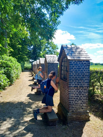 Hierna verlieten we de Lovenhoek om de laatste kilometers in te zetten terug naar Sportcentrum De Dreef. We passeerden nog de 14 Kappellekens die de 14 statiën afbeelden van de kruisweg en maakten er even een schietgebedje voor man en kinderen aan het thuisfront. Hierna begonnen we de moed wat te verliezen, want we bevonden ons terug op verharde wegen en we waren toch ook al even onderweg. Maar plots kwamen we dan toch nog een bordje tegen waar we blij van werden: het Sprookjesbospad.