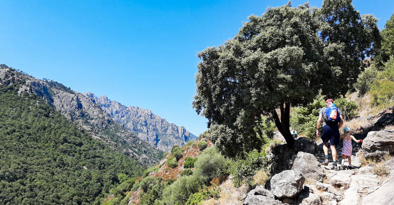Ook de omgeving van Corte is de moeite. In westelijke richting heb je de Gorges du Tavignano die je te voet vanuit het centrum van Corte kan bereiken. Je kan wandelen naar de voetgangersbrug Rossulinu waar je in de rivier kan zwemmen. Deze wandeling start in de buurt van het parkeerterrein aan de Rue Saint-Joseph. Volg het het bordje ‘refuge de la Sega’ en daarna de oranje route. Wij zijn aan de wandeling begonnen, maar na een uurtje merkten dat we het veel te warm was in de volle zon en we al bijna door onze watervoorraad zaten. Als je de wandeling doet, vertrek dan vroeg en zorg dat je voldoende water mee hebt. We hebben wel een prachtig zicht op Corte kunnen meepikken, maar zijn dan maar teruggekeerd. Aan de start van de wandeling kan je ook een weg nemen die rechtstreeks naar de rivier leidt. Ook hier kan je heerlijk rusten en afkoelen. We hebben dat dan maar gedaan. De kinderen vonden het ook leuk om over de rotsen te klauteren. Vergeet je zwemsloefkes niet.
