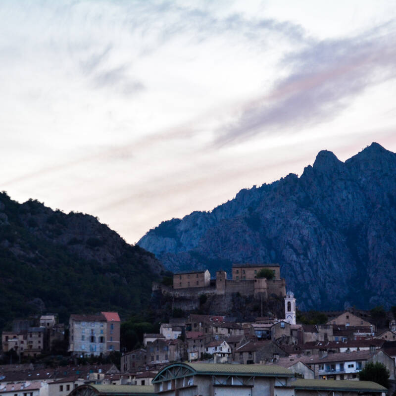 Een autorit en boottocht naar Corsica zagen we niet zitten. Hoewel het financieel wel interessanter blijft dan een “fly & drive” zouden we veel te lang onderweg zijn. We boekten een heen- en terugvlucht Charleroi – Bastia. Deze optie was toen de goedkoopste, maar er zijn nog een paar andere luchthavens waarop je kan vliegen zoals Ajaccio of Calvi. Met onze huurauto van Europcar, een Dacia Duster, begonnen we aan onze eerste slalom tot Corte. We waren verwittigd, op Corsica, en zeker in het bergachtige binnenland, is quasi geen enkel recht stuk weg. Je kan hooguit een paar honderd meter rijden of er volgt een bocht. Je bent dan ook vaak langer onderweg dan je op het eerste zicht zou denken als je je bestemming op een kaart opzoekt. En wie een gevoelige maag heeft in de auto bereidt zich best hierop voor. Corte ligt nu niet zo ver van Bastia, dus het eerste bochtenwerk viel wel mee en duurde maar een uurtje.